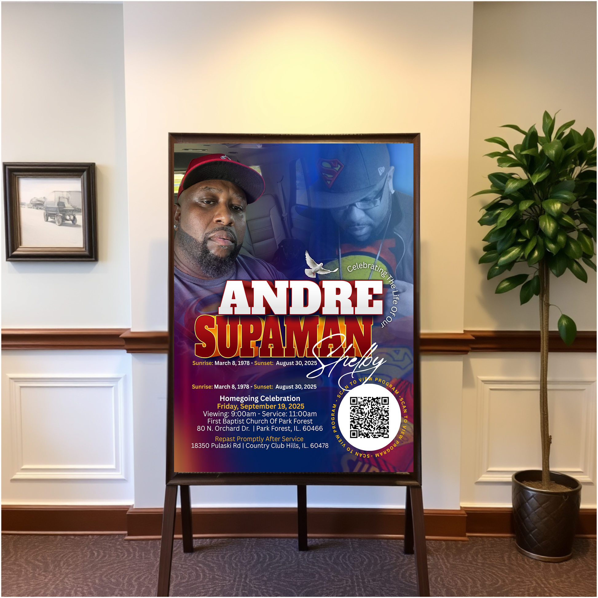 Each board (24x36) is thoughtfully designed to reflect your loved one’s personality and the theme of the service. Displayed at the entrance of the venue, it serves as both a welcoming focal point and a meaningful connection to memories — without the need for printed materials.